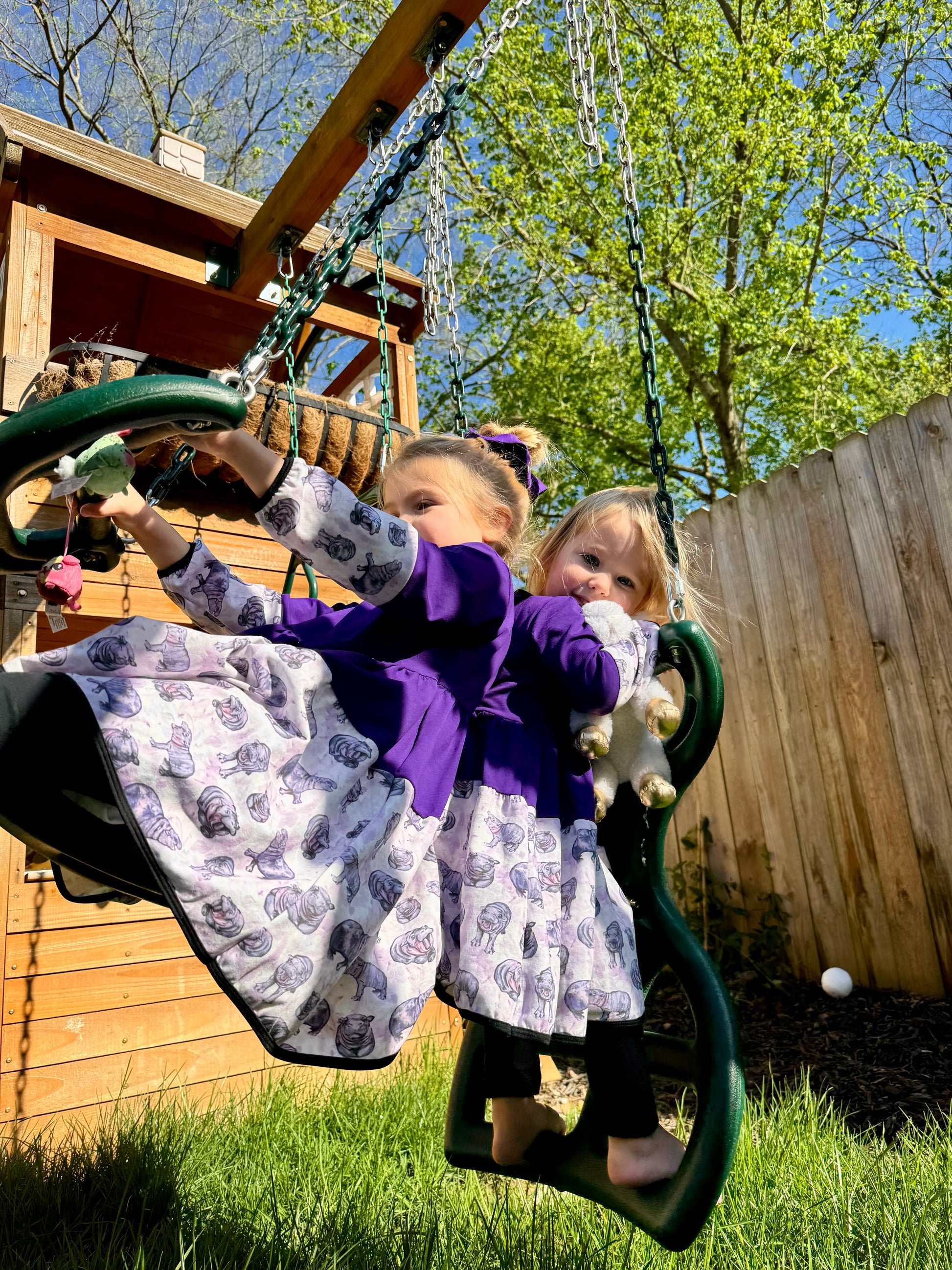 Let her twirl in style with this hippo-print twirl dress and matching leggings & scrunchie, made from 100% organic cotton for soft, breathable comfort. Designed for girls ages 12 months to 8 years, it features hand-painted hippos in purple and gray, a full gathered skirt, and charming black trim for extra flair.